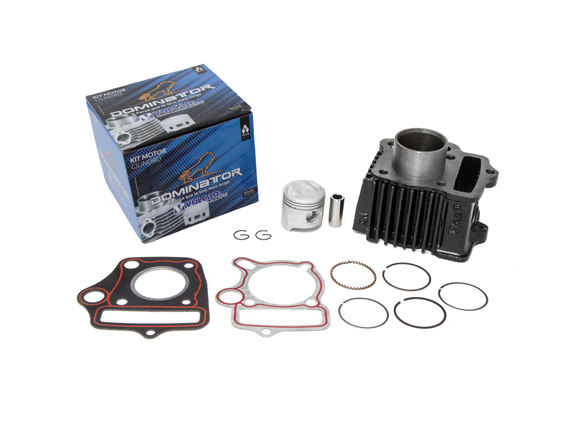 CONJUNTO CILINDRO-ÊMBOLO (PISTÃO), O KIT É COMPOSTO POR: CILINDRO DO MOTOR, JOGO DE ANÉIS, PISTÃO, PINO DO PISTÃO, TRAVA PINO PISTÃO, JUNTA DO CABEÇOTE E JUNTA DO CILINDRO. PART NUMBER COMPLEMENTAR: X050Q2M05/M034NN 50CC
